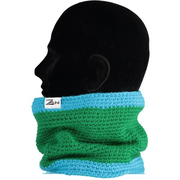 The Ronnie Neck Warmer features a green and blue crochet design. Made from Super-Soft Acrylic, it is soft, cosy, and non-itchy, sitting comfortably around the neck to provide reliable warmth.